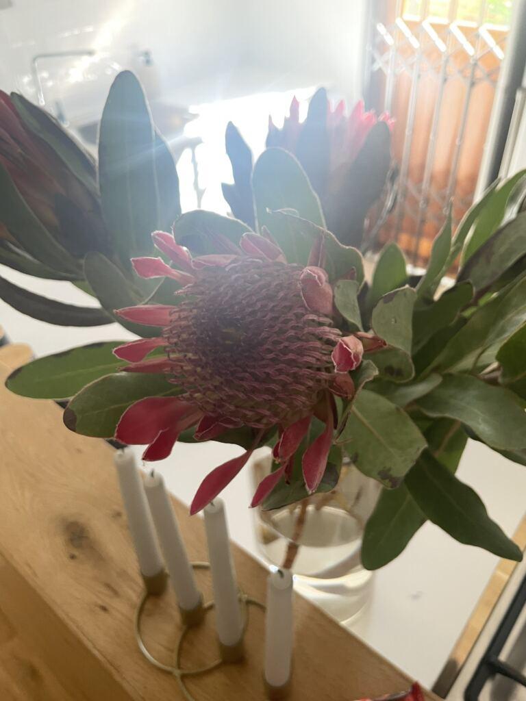 Unsere kleine Bleibe heißt uns willkommen mit Kerzen für den Stromausfall und Proteas.