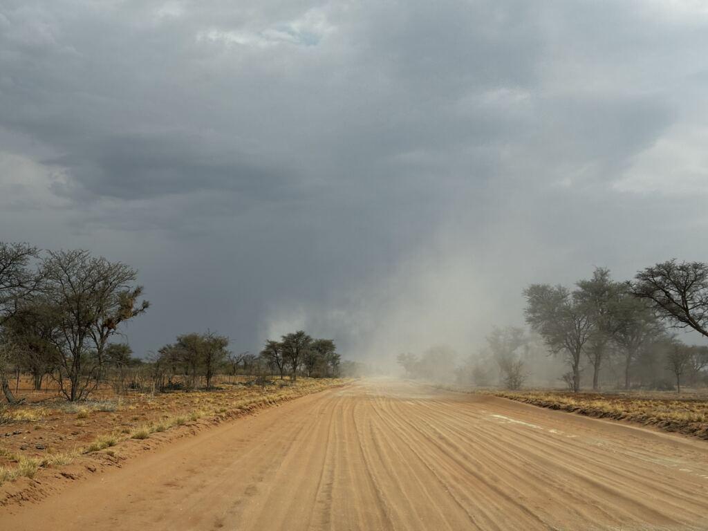 Doch langweilig wurde uns nicht, wir erlebten unsere erste Sandverwehung. Interessant: denn man sieht wirklich nichts mehr. Die Luft ist gelb und links und rechts ist das blau vom Himmel zu sehen. Danach haben wir für die letzten 30 km eine Sandpiste erreicht. Da hat das Autofahren richtig spaßig gemacht, denn Sandpisten werden hier mit 80 km/h gefahren, was in Deutschland unvorstellbar ist. Da aber weder rechts noch links irgendetwas zu sehen ist, außer Sand vielleicht nur ein kleiner Busch und es sich tatsächlich auch so richtig fetzt, hat es uns natürlich auch nicht abgehalten diese Sandpisten so zu fahren. Man fühlt sich ein wenig wie in einem Actionfilm, denn der Sand, der hinter einem aufgewirbelt wird, hinterlässt eine wahnsinnige Staubwolke.