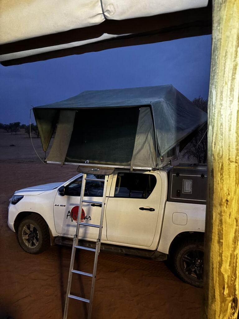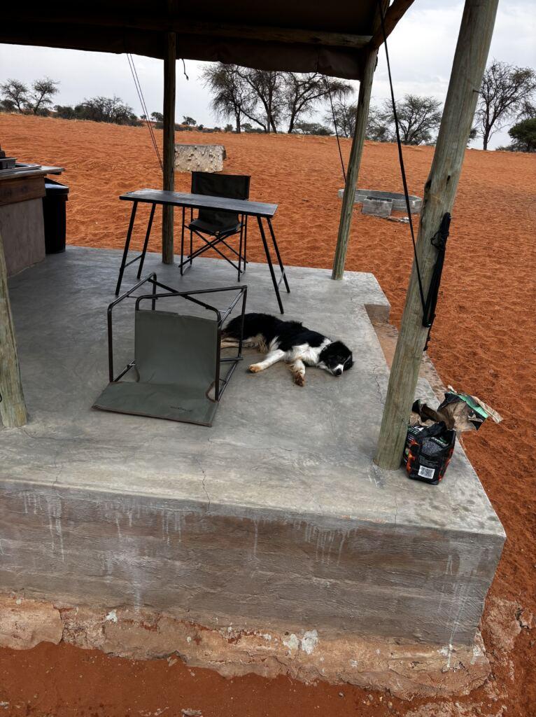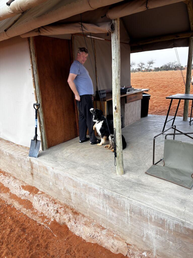 Doch was wir noch nicht wussten, ist, dass der Abend noch nicht . Es fing an zu regnen und zu Gewittern mitten in der Wüste. Doch das war noch ganz gemütlich, da es nicht so heftig war wie bei uns in Deutschland. Irgendwann um 21:30 Uhr dachte ich dann vielleicht gehe ich noch mal auf Toilette Naja, sagen wir besser, versuchte aus dem Zelt zu krabbeln. Stolz mit meiner Stirnlampe, die auf Rotlicht eingestellt war, damit uns Motten und Mücken in Ruhe ließen, die Füße. Schon an der Leiter blickte ich nach links und erschrak unendlich. Ich starte in zwei Augenpaare, ich schrie, und war mir nicht sicher, was mich gerade anstarrte. Hyäne, Wolf, Fuchs… keine Ahnung. Erst nachdem meine Beine wieder drinnen waren und ich einen zweiten Blick auf dieses Augenpaar werfen konnte, stellte ich fest, es ist ein Hund. Oh mein Gott, mein Adrenalin war richtig hoch aber so konnte ich wenigstens noch einmal das Zelt verlassen. Und dieser liebe Hund war so kuschelbedürftig, dass er erst einmal gekrault werden wollte und tatsächlich die ganze Nacht vor unserem Zelt geschlafen hat.