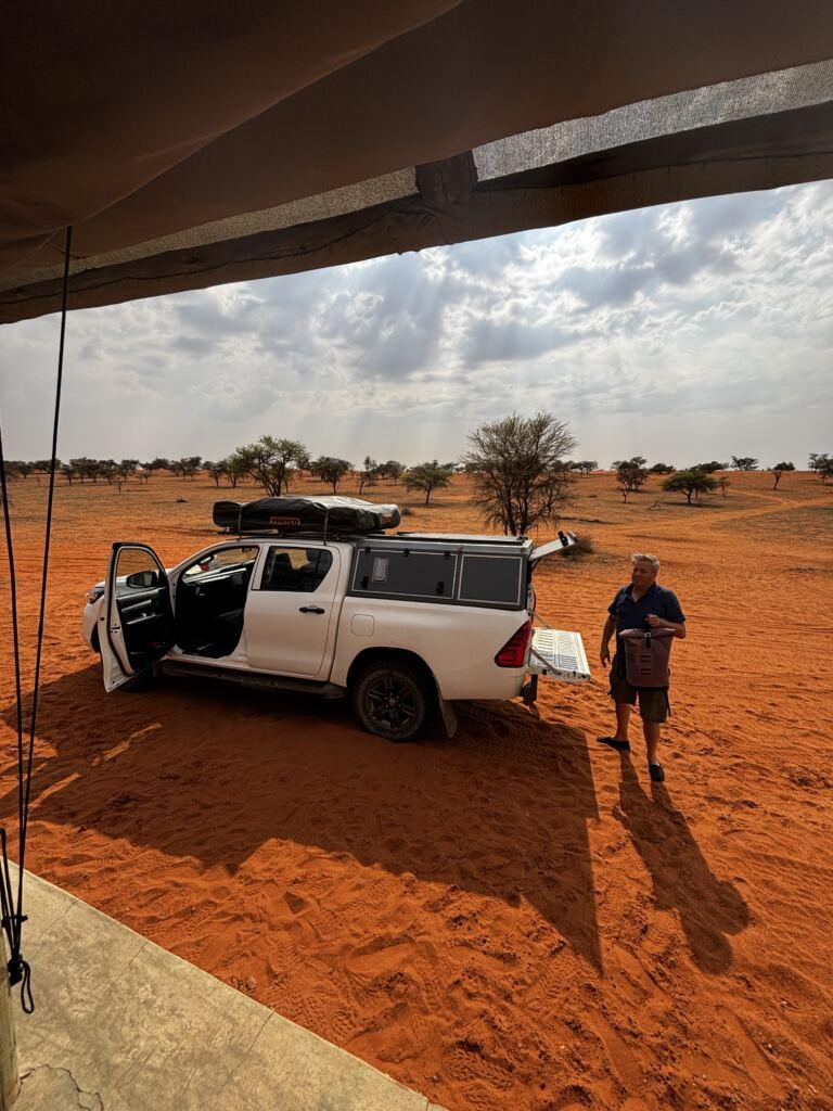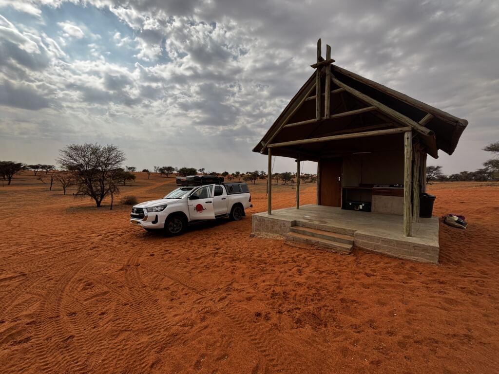 Wir waren gut dran, es war 16:30 Uhr und wir hatten nur noch circa 10 km und da standen wir vor einem verschlossenen Straßentor. Doch wie der Ricky so ist, nahm er sein Handy, ich wunderte mich, denn Empfang gab es nicht, aber er dachte, vielleicht hätte er in einer E-Mail von der Betreiberin des Campingplatzes eine Wegbeschreibung bekommen. Hatte er auch, doch leider endete sie am Tor. Meine Ungeduld wunderte sich und ermahnt ihn schon, dass Google doch keine Antwort hätte, wie man ein Tor öffnet. Ich war kurz davor, einfach auszusteigen und das Tor zu öffnen. Doch so einfach geht es hier bei uns im Auto nicht. Nachdem Ricky sich überzeugt hatte, dass wir an der richtigen Stelle waren, stiege er aus und öffnete, oh, Wunder, das Tor. Wäre ich ausgestiegen, hätte er das Auto fahren müssen, was gerade undenkbar ist. Egal wie wir fuhren erneut 10 km und öffneten ein Tor nach dem andern sind. Ur plötzlich standen dort zwei Hütten in der Im. Nichts eine auf dem Hügel, die andere im Tal, und wir sahen Menschen also fuhren wir dieser Hütte mit den Menschen und fragten, ob sie willkommen worden sind oder ob sie sich selbst die Hütte einfach genommen hätten. Somit wussten wir, dass die andere Hütte unsere war. Endlich angekommen. Und dieses Erlebnis lässt sich auch nicht wirklich in Worte fassen, denn die Hütte stand im Nichts einfach in den roten Dünen doch dann kam ein Auto, und in dem Auto war die Besitzerin, die uns begrüßte und eine kleine Einweisung gab.